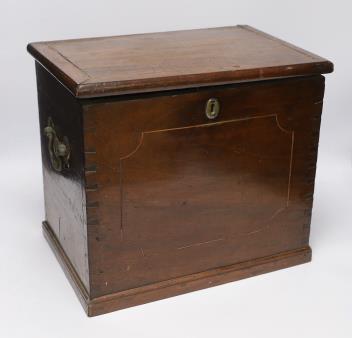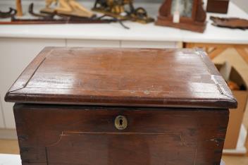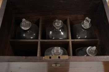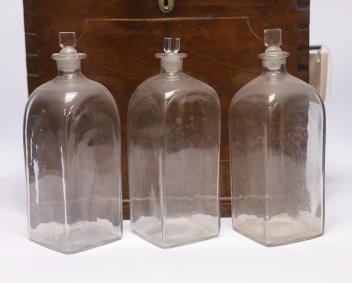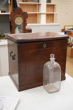 Lot 1425 , A Georgian mahogany decanter box, fitted with six original plain glass decanters and stoppers, hinged lid and twin brass carrying handles, width 39cm