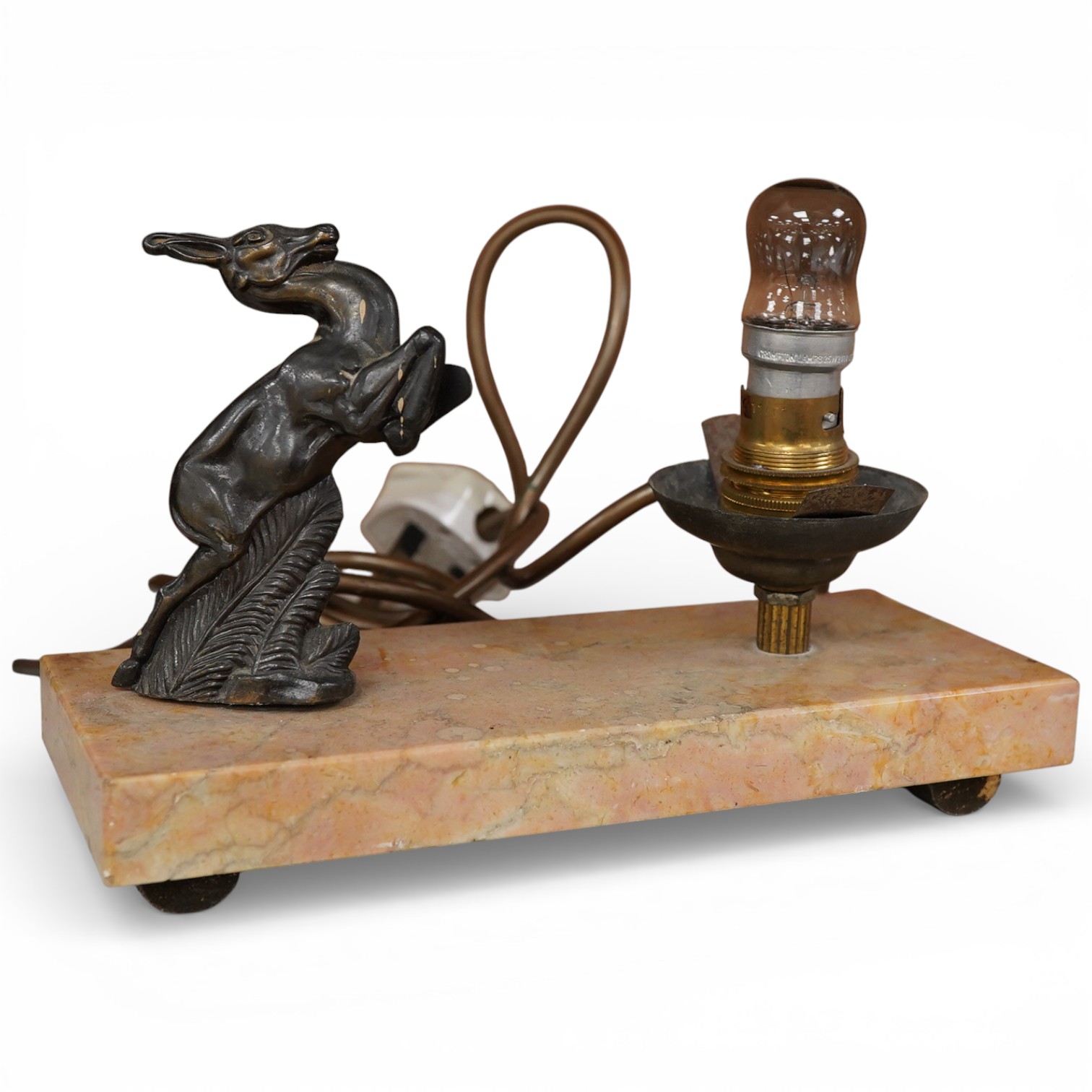 An Art Deco spelter and marble lamp base, surmounted with a leaping deer, 22cm wide
