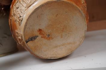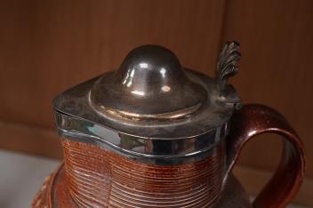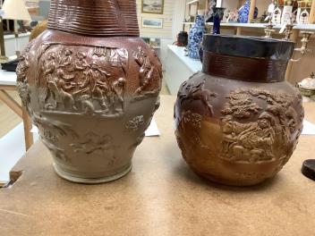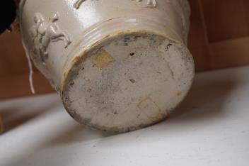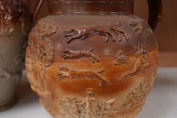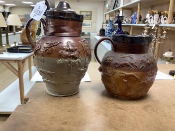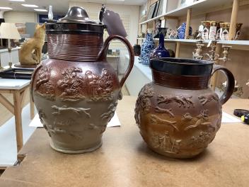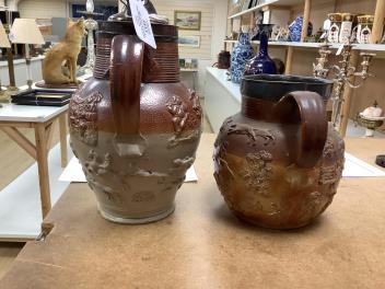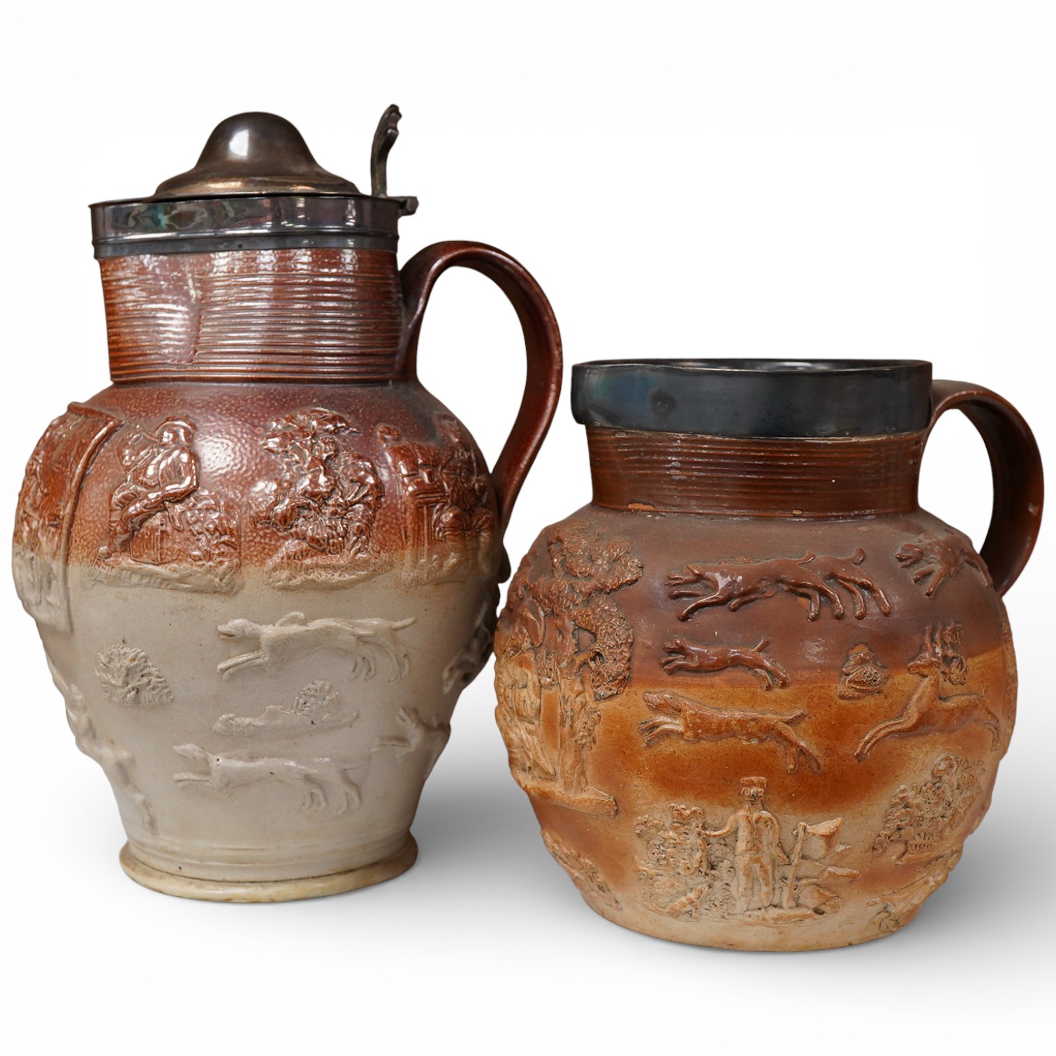 Lot 1413 , Two 19th century Mortlake salt-glazed stoneware harvest jugs, the smaller example with silver mount, largest 26cm high