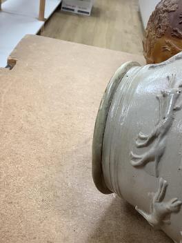 Larger jug with two professionally restored chips to footrim, image 8, not easily spotted; otherwise good including plated mount. Smaller jug two long cracks downward from neckrim, images 9 and 10, clearly visible at interior, but not so easily seen at exterior; three-way star-crack to underside as shown; in need of a clean; silver mount hallmarked London 1879.