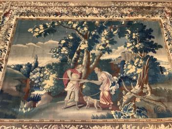 the scene depicting Leander and Hero both holding a long handled spear in a wooded clearing near water with a castle building in the background, the tapestry framed with a wide ornate swagged botanical border, 343cm x 261cm