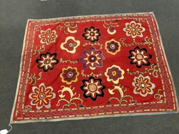 made from two scarlet coloured cotton panels, 59cm and 47cm wide, sewn together and hand embroidered with large bold polychrome silk floral motifs with two embroidered stripes outlining a simple scrolling border finished in a grey tape edging, the Suzani backed with a cream striped cotton, 132cm x 108cm