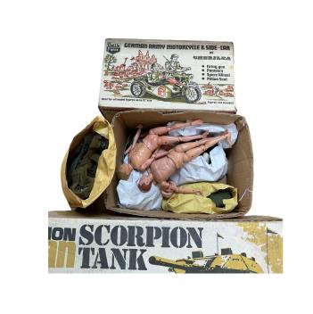 A collection of Action Man dolls and accessories, including; three dolls (a.f.), together with a good selection of clothing, uniforms and accessories, plus two boxed vehicles; a Cherilea Battle Force German army Motorcycle & Side-car, and a Palitoy Scorpion Tank, plus two unboxed military vehicles; a Jeep and an armoured car