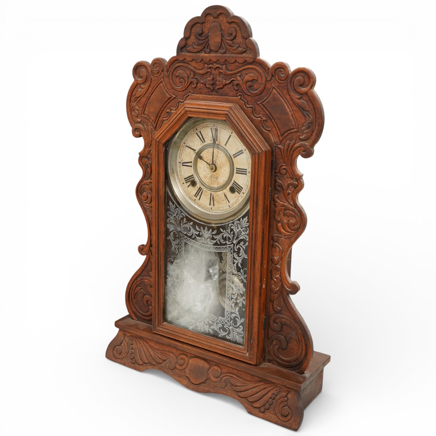 An American carved wood mantel clock manufactured by The Ansonia Clock Company, New York, with pendulum and key, 57cm high