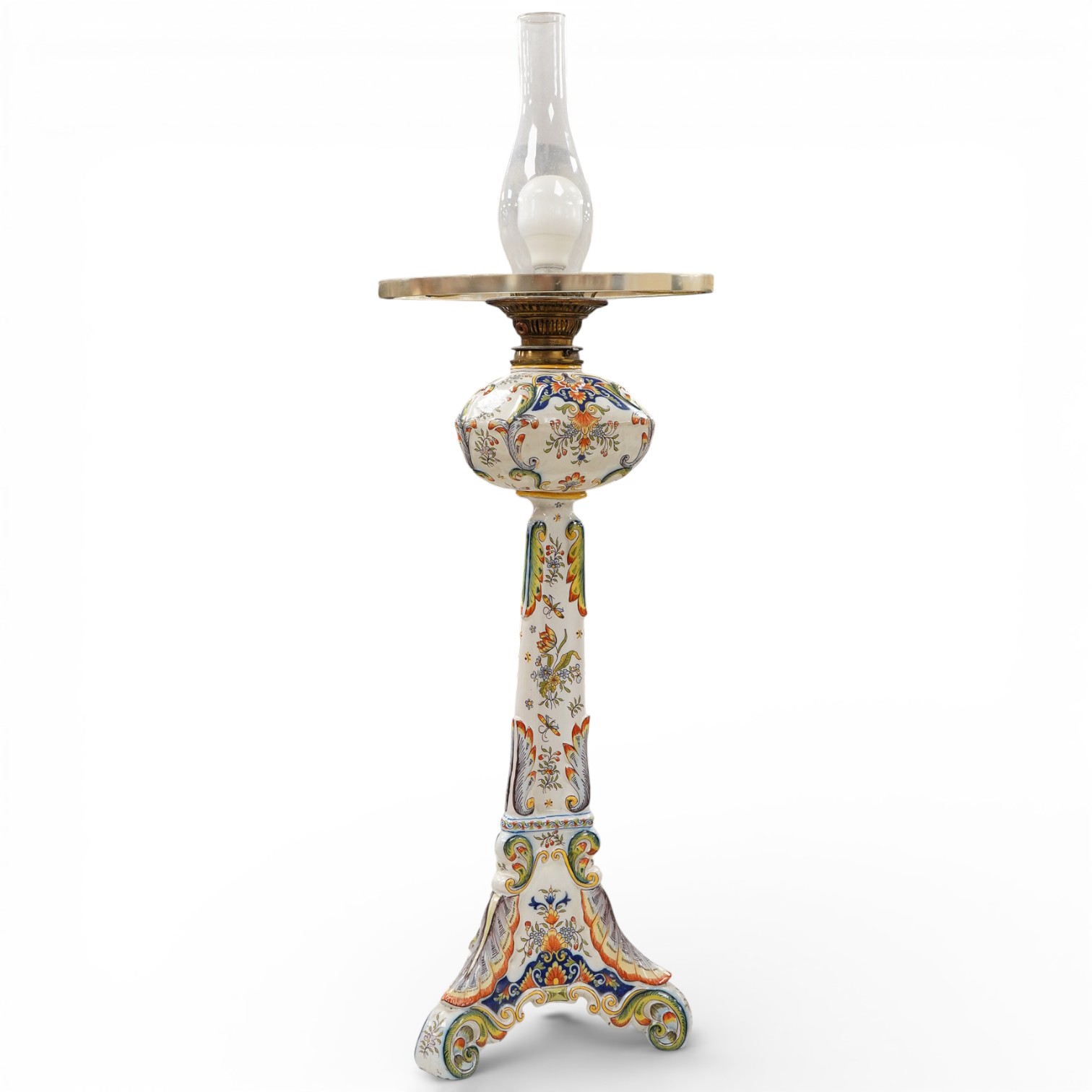 A tall 19th century French faience lamp, base 62cm high not including brass fitting and funnel.