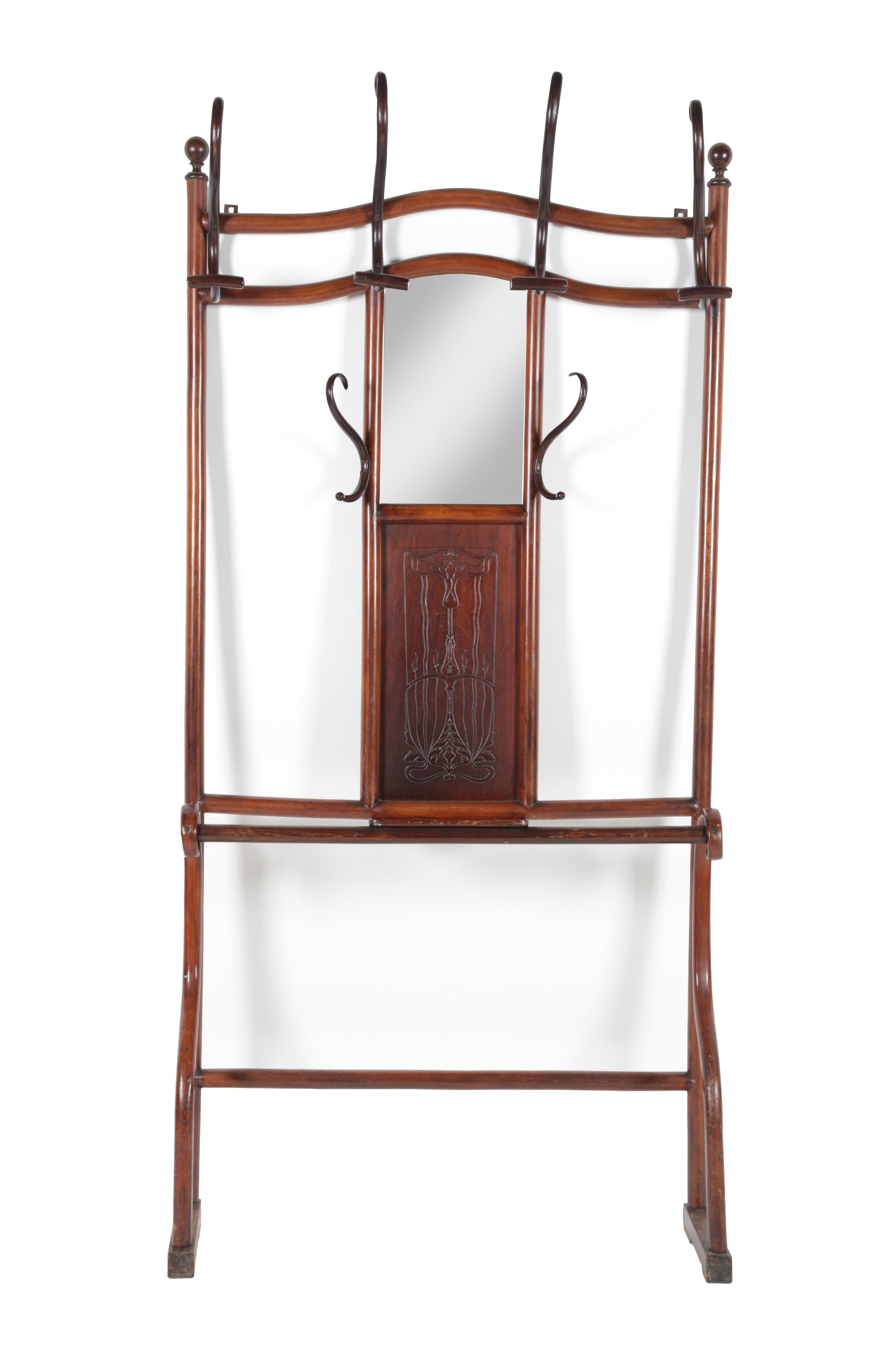 Thonet: An Art Nouveau hall stand, the arched crest rail surmounted by turned finials and fitted with four shaped hanging hooks above a gently curved crossbar, the central section inset with a rectangular bevelled mirror, flanked by a pair of scrolling coat hooks and above a carved panel decorated with a stylised foliate motif typical of the period, over a stretchered base with bentwood supports terminating in block feet, 209cm high x 97cm wide