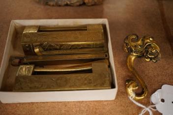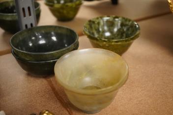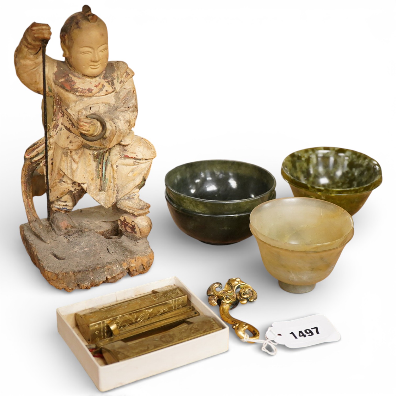 Lot 1497 , A Chinese Han dynasty-style gilt-bronze belt hook, two Chinese brass locks, a Chinese carved wood warrior, and six Chinese hardstone bowls, warrior 24cm high