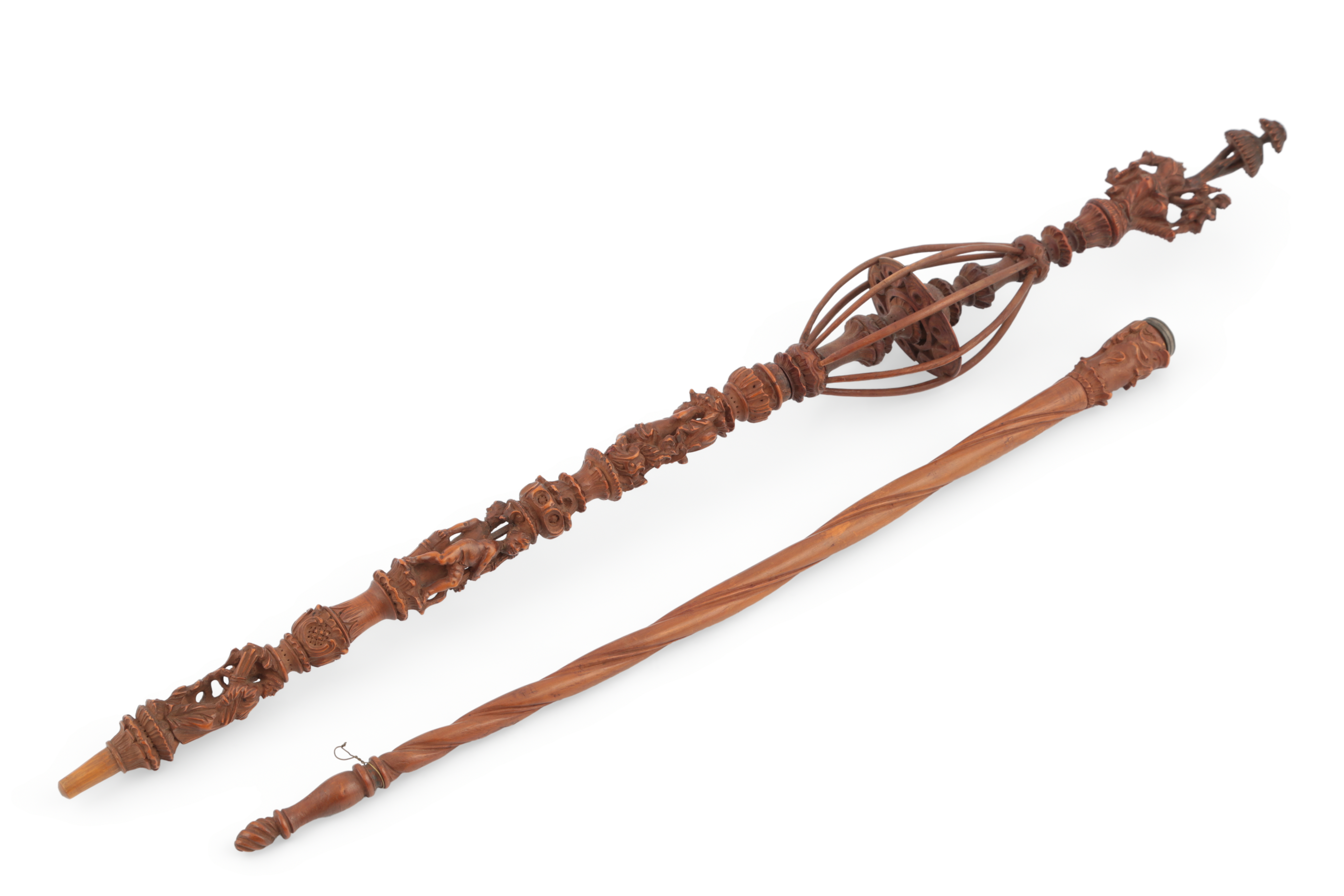 carved with numerous figures and scrolls, over a spiral fluted stem, 83cm overall