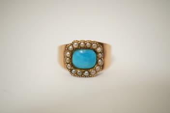 Lot 942 , A George III turquoise and seed pearl ring, early 19th century, centring on a rectangular section of polished turquoise, within a border of seed pearls, mounted in gold, size L1/2, gross weight approximately 2 grams