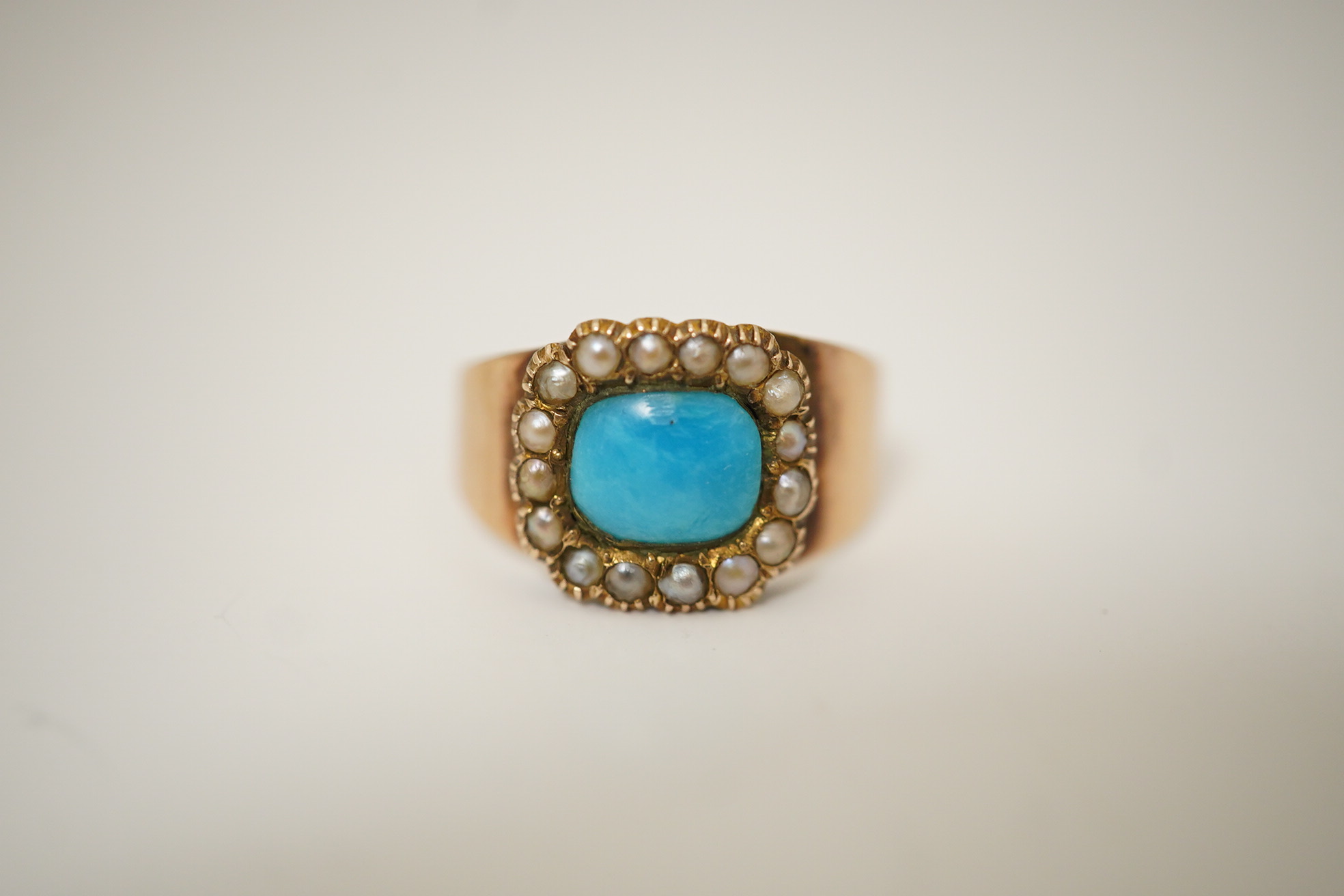 A George III turquoise and seed pearl ring, early 19th century, centring on a rectangular section of polished turquoise, within a border of seed pearls, mounted in gold, size L1/2, gross weight approximately 2 grams