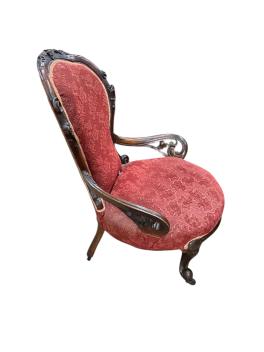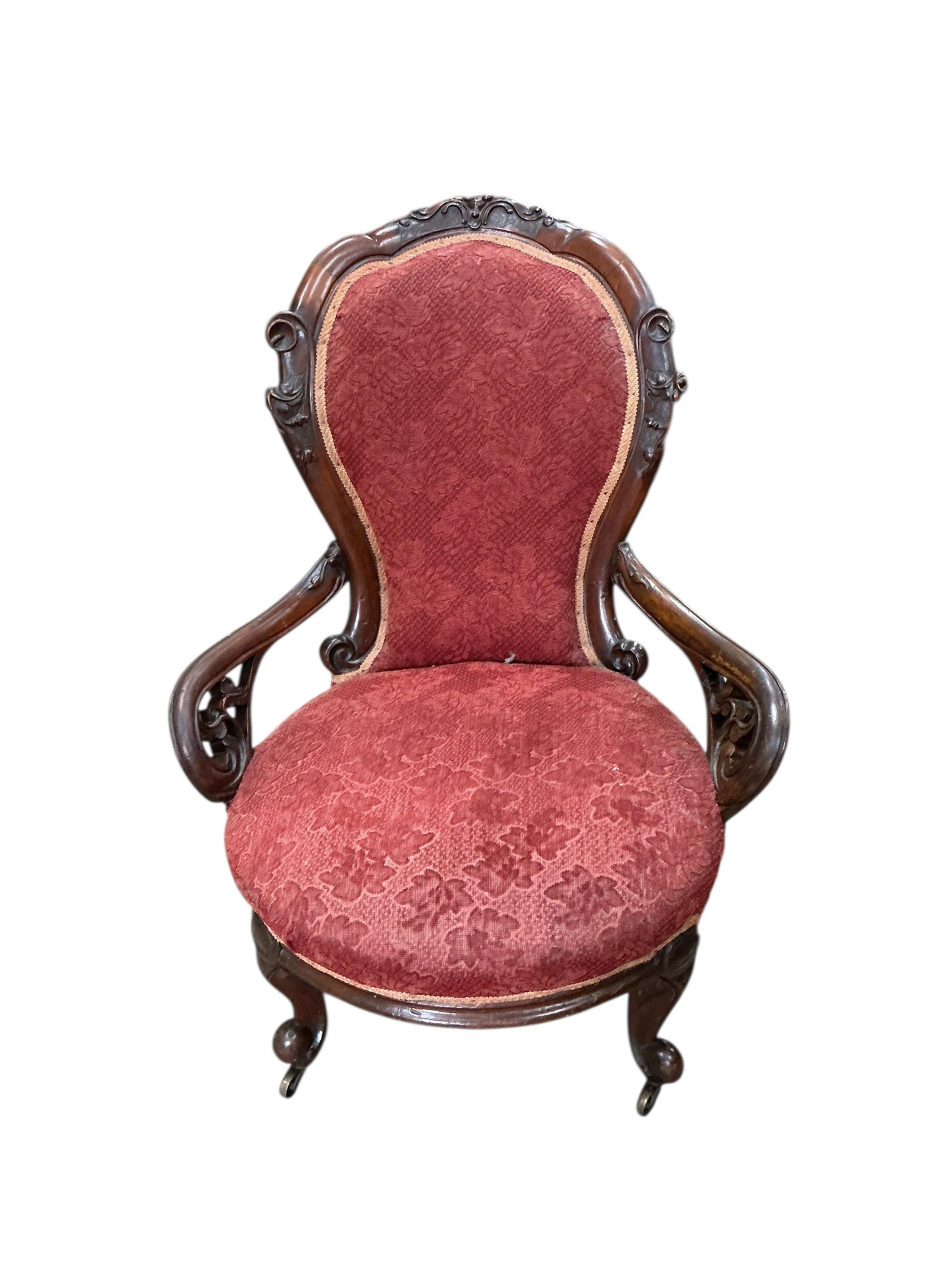 A Victorian carved mahogany upholstered armchair, width 74cm,depth 70cm, height 98cm