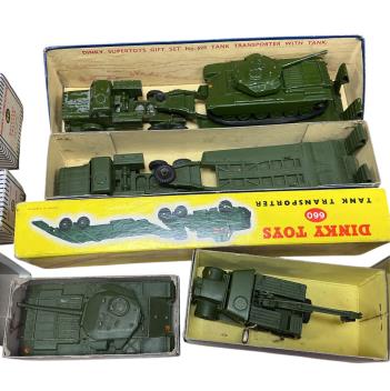 Lot 97 , Nine boxed Dinky Toys military vehicles; a Tank Transporter with Tank gift set (698), a Recovery Tractor (661), a Medium Artillery Tractor (689), etc.