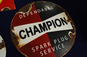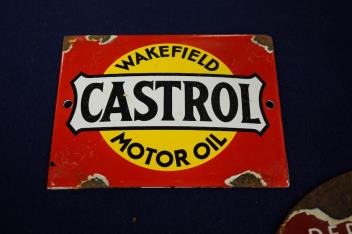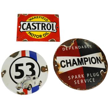 Lot 138 , Three small enamel motoring signs; a Champion Spark Plug service advertising disc, diameter 15cm, a Wakefield Castrol Motor Oil advertising plaque, 12cm wide, and a modern enamel of Herbie