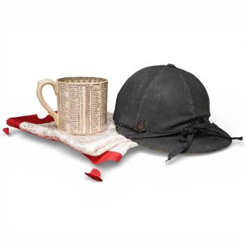 Lot 1472 , An old black Jockey’s cap by Woodrow, a 1935 Grand National commemorative silk scarf and “The Centenary St Leger mug-9.5cm high