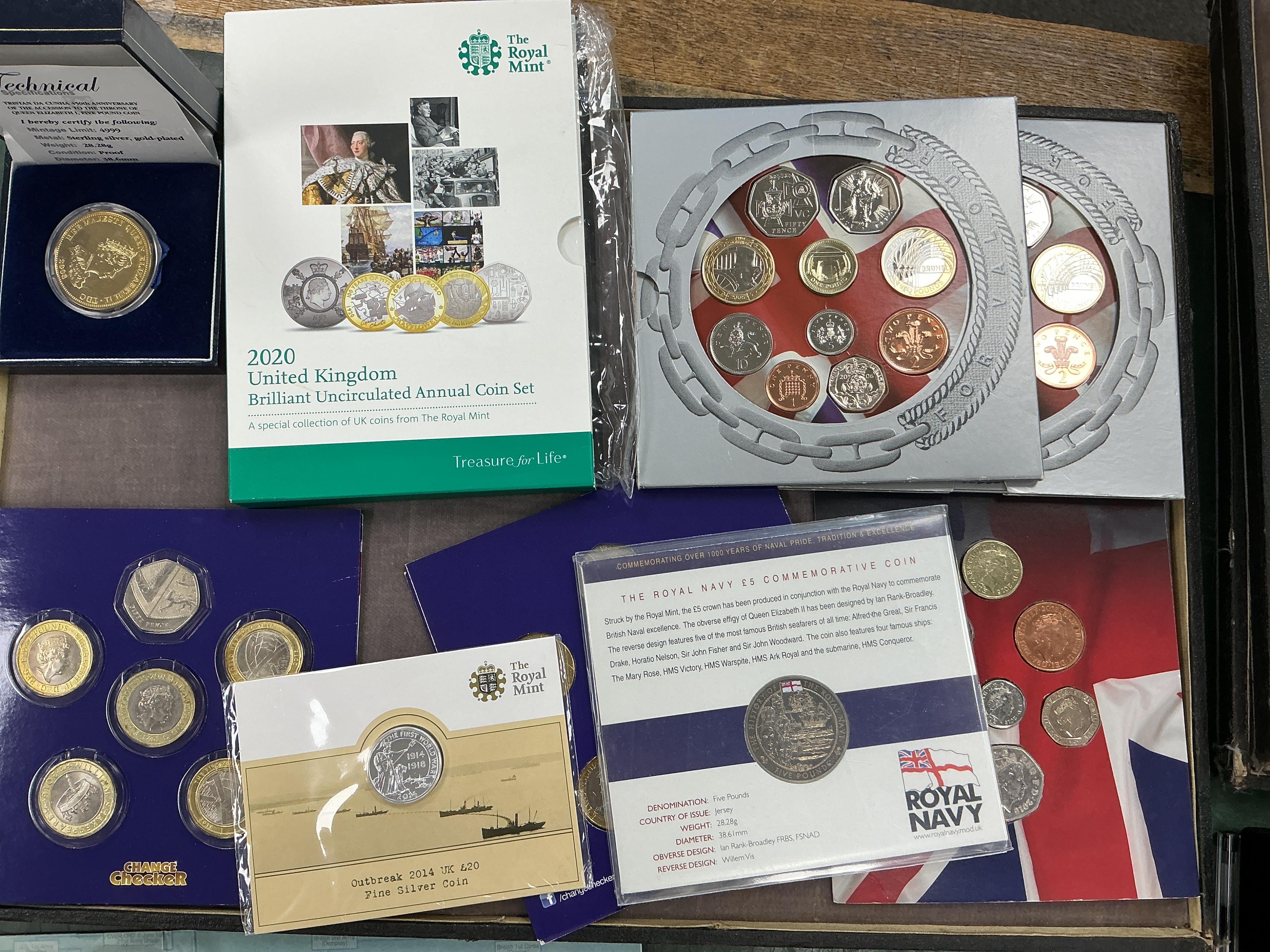 British coins, Elizabeth II Mint, fine silver £20 coin 2014, two 2020 BUNC coin set 2006, various coins in change checker packaging, sterling silver proof £5 coin, Various gold plated commemorative medals