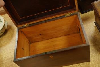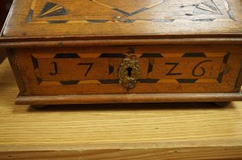 Four 18th century and later Danish boxes to include a marquetry inlaid example with sloped lid and a mahogany example, largest 30cm wide