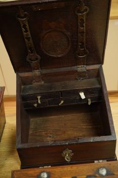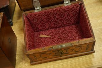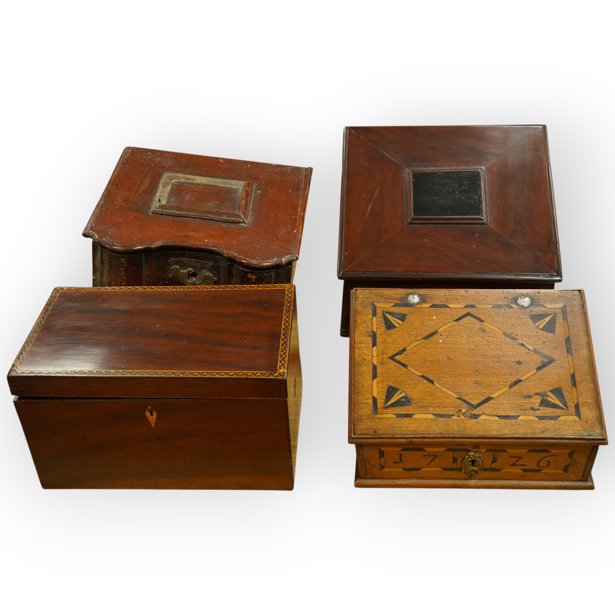 Lot 437 , Four 18th century and later Danish boxes to include a marquetry inlaid example with sloped lid and a mahogany example, largest 30cm wide