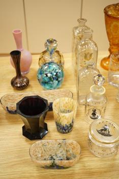 A collection of 19th century and later Continental glassware to include an amber flashed goblet and cover, ruby glass decanter, engraved tumbler, scent bottles and a paperweight