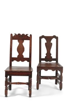 A Charles I joined oak merchant’s panel back box-seated armchair, the hinged seat mounted with the original iron hinges, the twin panelled back carved with a stylised cross in diamond device, 62cm wide, 62cm deep, 91cm high, together with two early 18th century joined oak backstools, tallest 103cm (3)