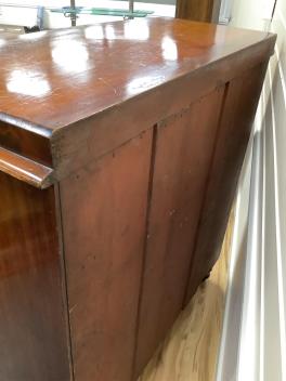 Generally fair: top with old stains; back is strong and undisturbed; no unsightly damage seen; drawer-bottoms are pine; handles and escutcheons are complete.