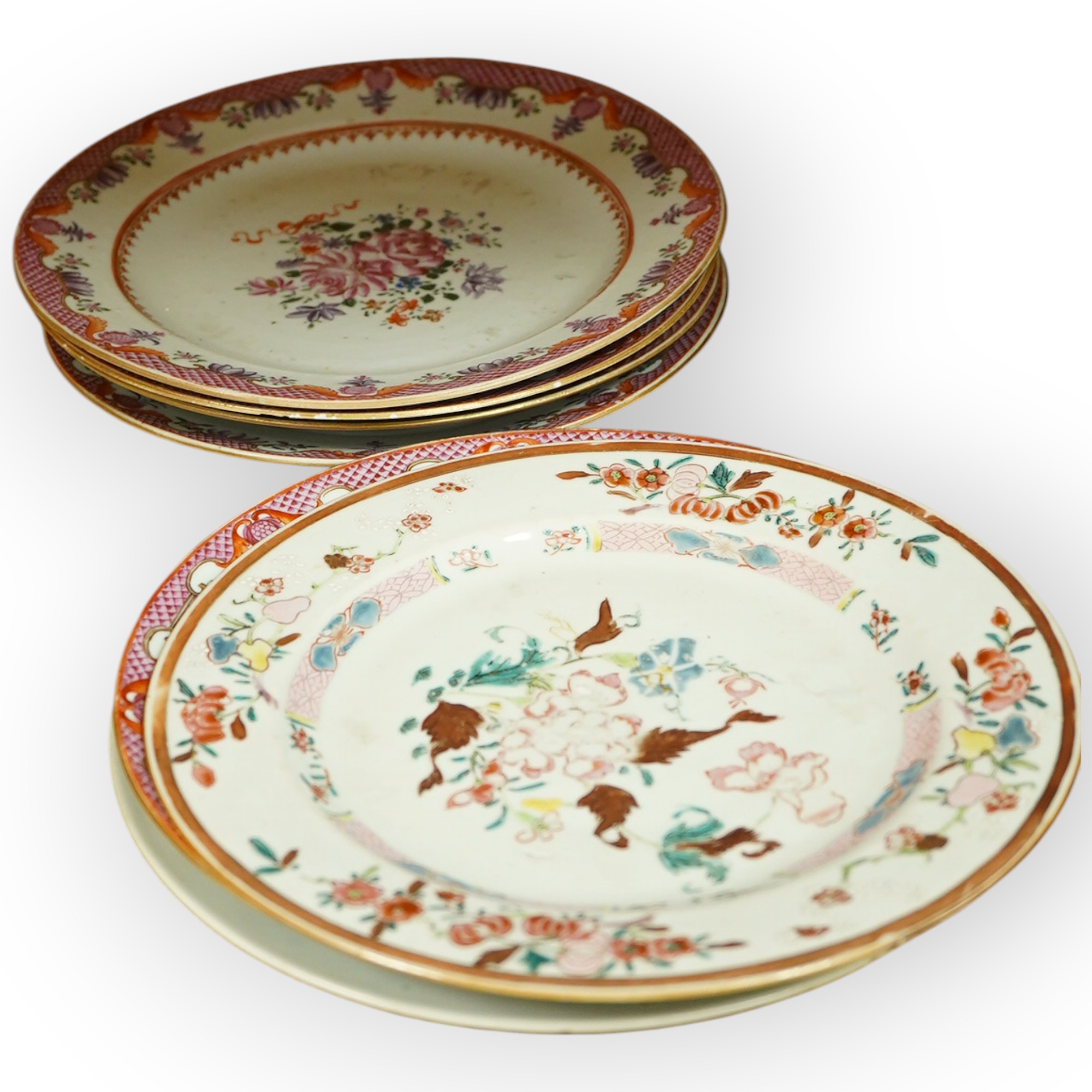 A group of seven Chinese 18th century export famille rose plates, largest 23cm in diameter