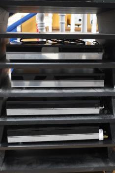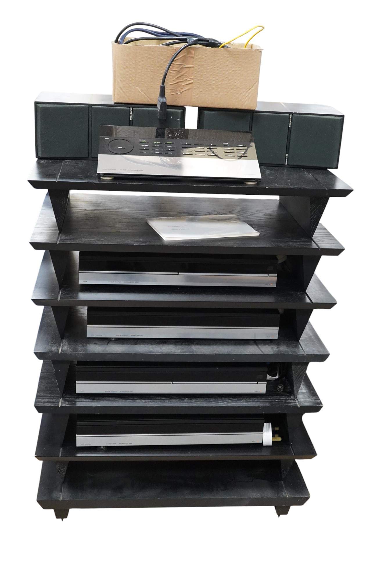 A Bang & Olufsen stereo hi-fi system including; a Beomaster 6500 amplifier, a Beogram CD 6500 CD player, a Beocord 6500 tape deck, a Beomaster 7000 FM/AM Receiver, a pair of Beovox CX100 shelf speakers and a 6500 Master Control Panel, contained within a black finished stacking modular hi-fi rack also originally retailed by Bang & Olufsen