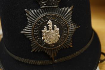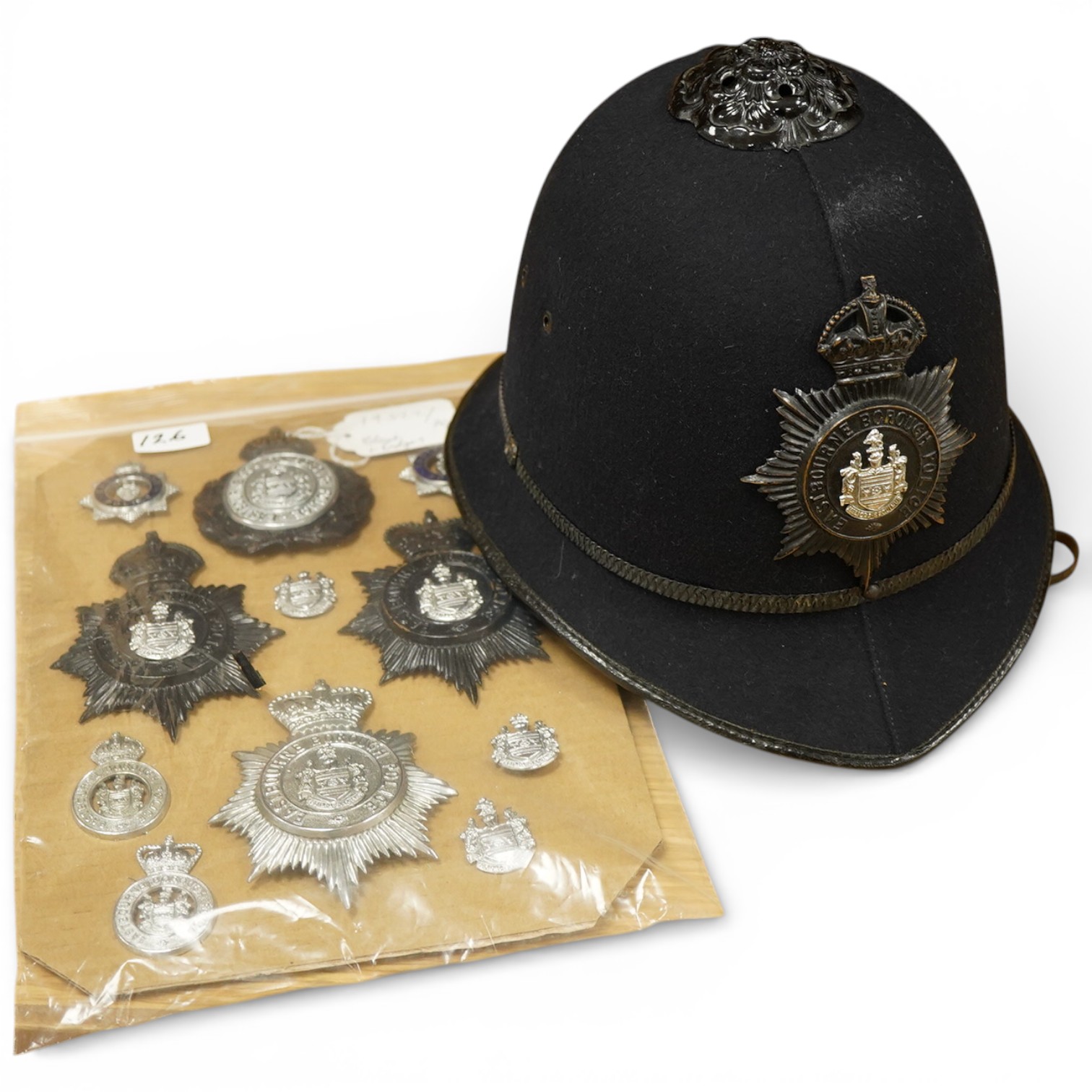 Lot 126 , Eastbourne County Borough Police Helmet, also with helmet plates, cap & uniform badges, (12).