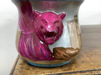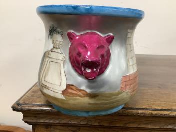 One leopard-head handle teeth missing - image 6; flakes to purple enamel at other handle, image 7; inside is hollow, image 8; galvanised metal liner repaired, image 9. Maker/retailer Juste & Co, Paris, image 5.