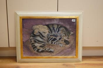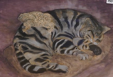 Lot 753 , Late 20th century, study of a cat and toad, indistinctly signed, mixed media, 38 x 53cm