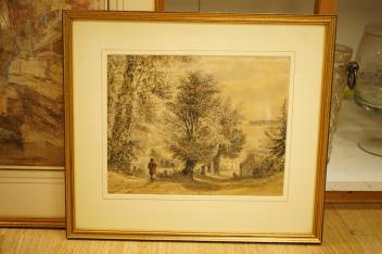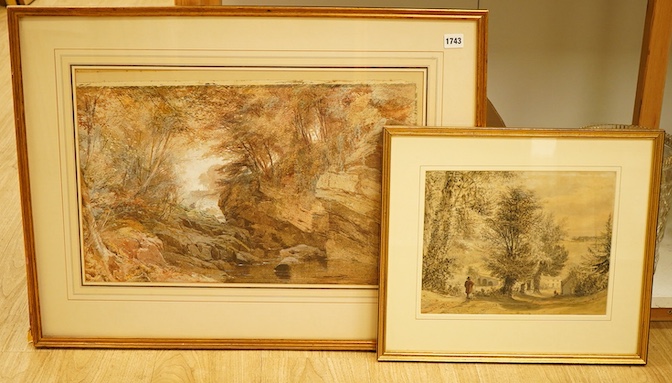 Lot 1743 , George Arthur Fripp (1813-1896), Figure approaching a village, near a bridge, signed and dated 1857, watercolour, together with another watercolour of an angler before a bridge, largest 36 x 56cm
