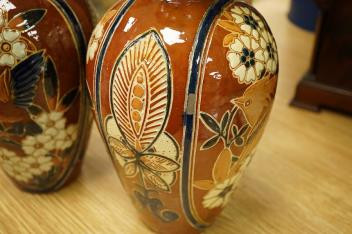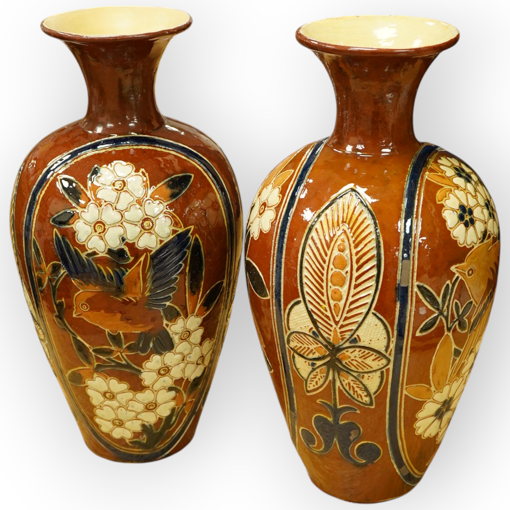 Lot 435 , A pair of C H Brannam pottery vases, dated 1885, decorated with stylised flowers and birds, each with incised signature to the base, 29cm high
