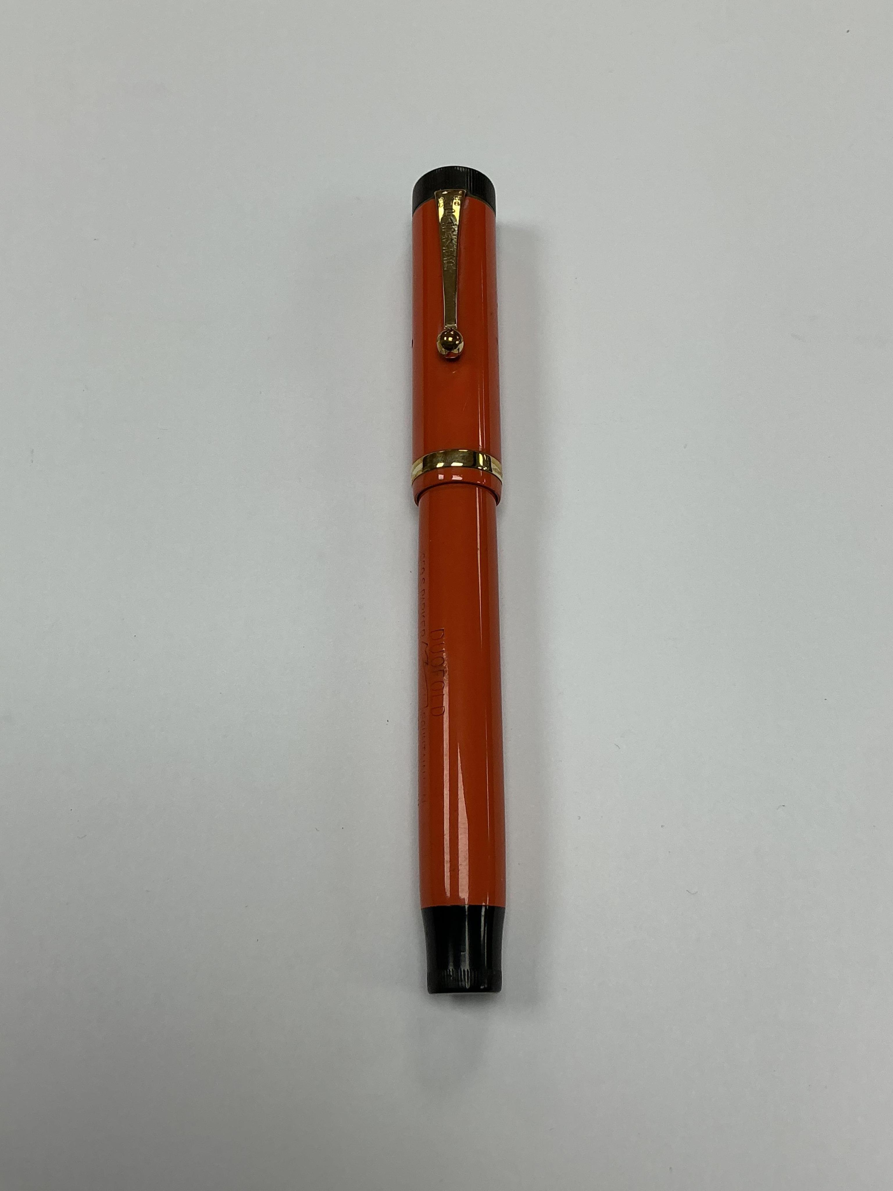 Lot 95 , A Parker Lucky Curve Duofold Senior in red hard rubber with 'large' barrel imprint