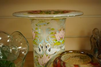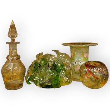 Lot 462 , An early 19th century cut glass decanter and stopper, a glass floral centrepiece, an art glass globular vase and an enamelled Rosenthal vase - 21cm high