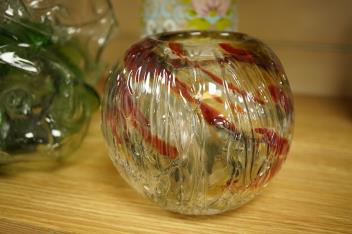 An early 19th century cut glass decanter and stopper, a glass floral centrepiece, an art glass globular vase and an enamelled Rosenthal vase - 21cm high
