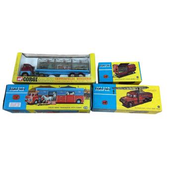 Four boxed Corgi Toys Chipperfield’s Circus vehicles; a Corgi Major Chipperfield’s Menagerie (1139), a Circus Horse Transporter with Horses (1130) complete with its inner card display stand and packing piece, a Chipperfield’s Circus Crane Truck (1121) complete with inner card packing pieces, and a Chipperfield’s Circus Animal Cage (1123)
