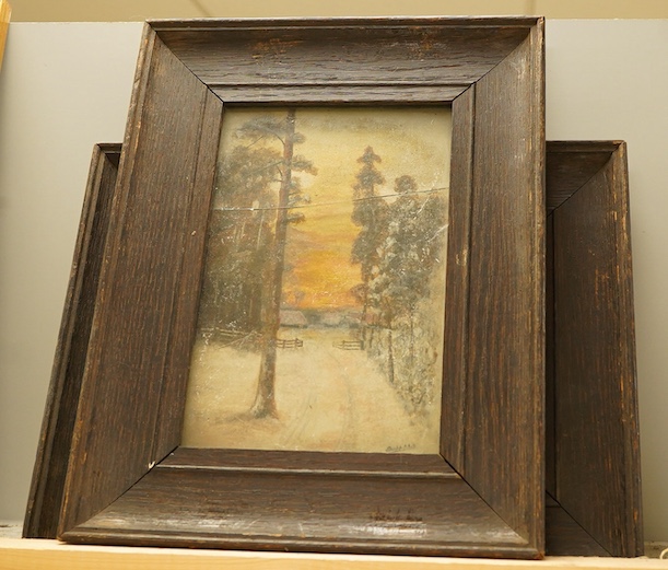 J. Dunlop, winter landscapes, each signed and dated ‘19, a set of three oils on card, oak framed, 21 x 14cm