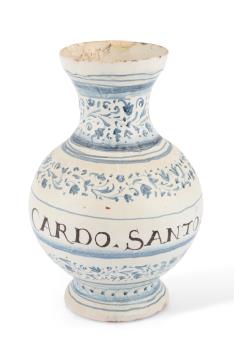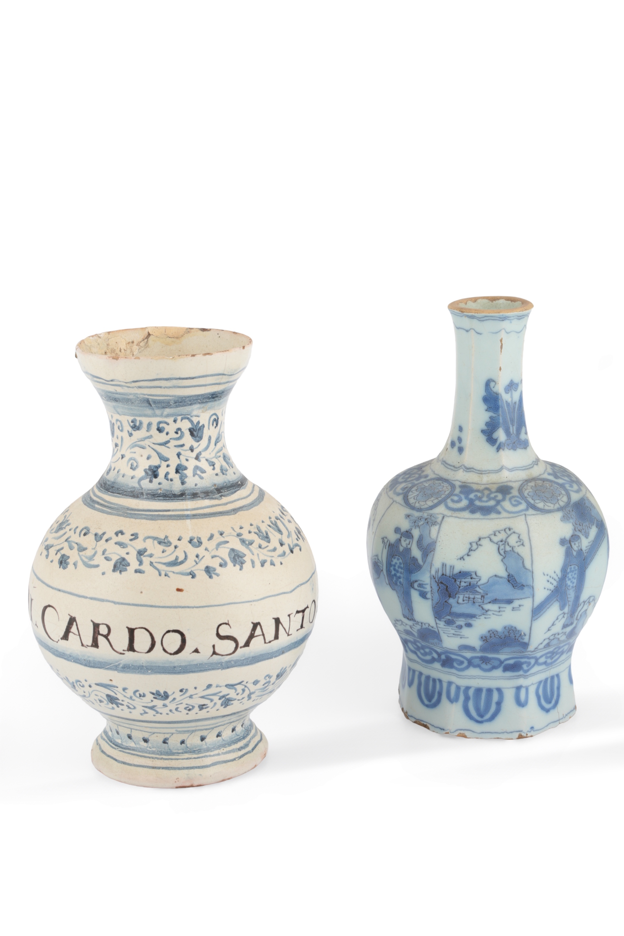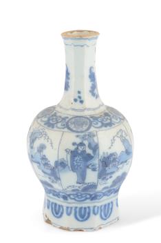 Lot 9 , A Delft kraak style blue and white bottle vase, late 17th century, and an Italian maiolica drug jar