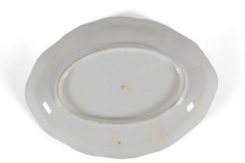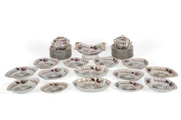 comprising a pair of sauce tureens and covers, 17.5cm wide, and stands, a rectangular footed dish, 29cm wide, a pair of kidney-shaped dishes, four leaf shaped dishes, six lozenge shaped dishes, in two sizes, and twenty four plates, complete with early 20th century inscribed inventory stating that the service was given to J H Streatfield of Chiddingstone by the Countess de Baillet in 1913