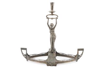Manner of WMF: A table centrepiece, modelled with a central maiden holding aloft a single candle sconce, standing on the central section of a navette-shaped base (lacking glass liners), 47cm x 50cm