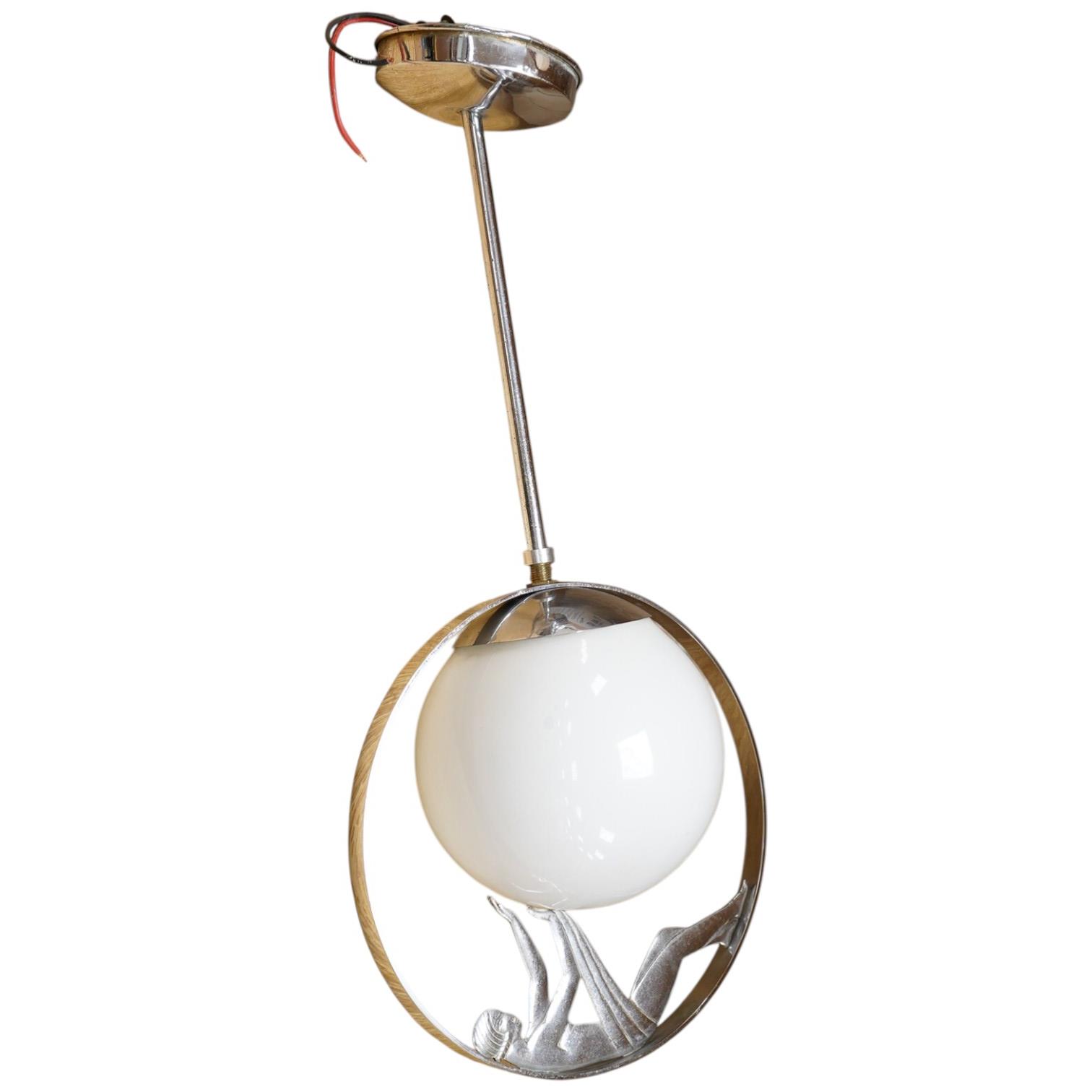 Lot 3174 , An Art Deco ceiling light lamp featuring a polished chrome silhouette of a female figure, length 56cm.