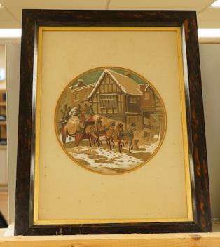 Lot 1702 , George Cruikshank, Coaching Scene, ‘Chester to London’, signed, tondo watercolour, coromandel framed, 19cm in diameter