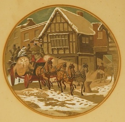 George Cruikshank, Coaching Scene, ‘Chester to London’, signed, tondo watercolour, coromandel framed, 19cm in diameter