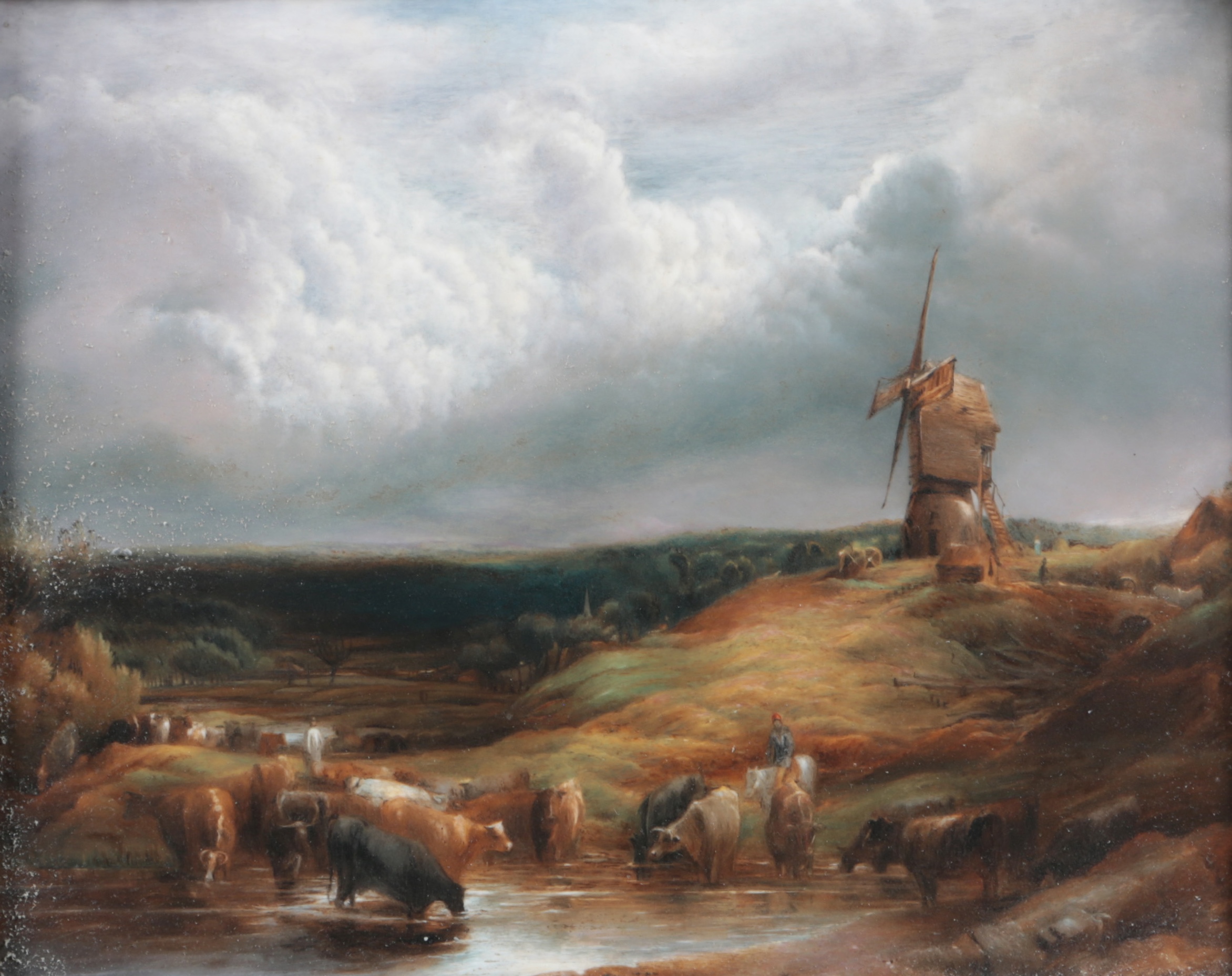 painted with cattle by a windmill in a landscape, inscribed verso, 31cm x 38.5cm, in a gilt and composition frame