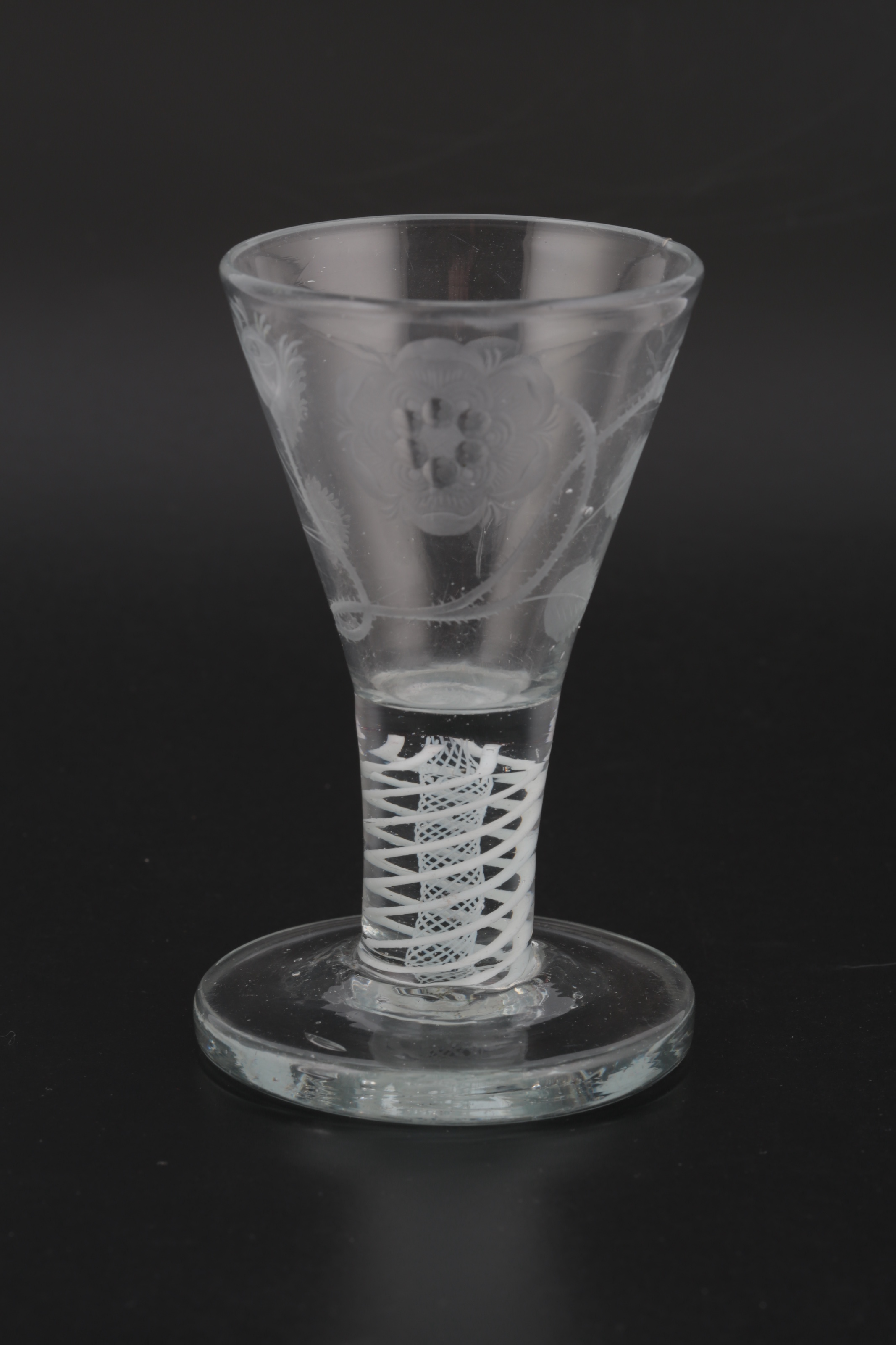 Jacobite interest - a Dutch DSOT toast master’s glass, the conical bowl wheel engraved with roses and other foliage above an opaque twist stem and a thick foot, 11.2cm