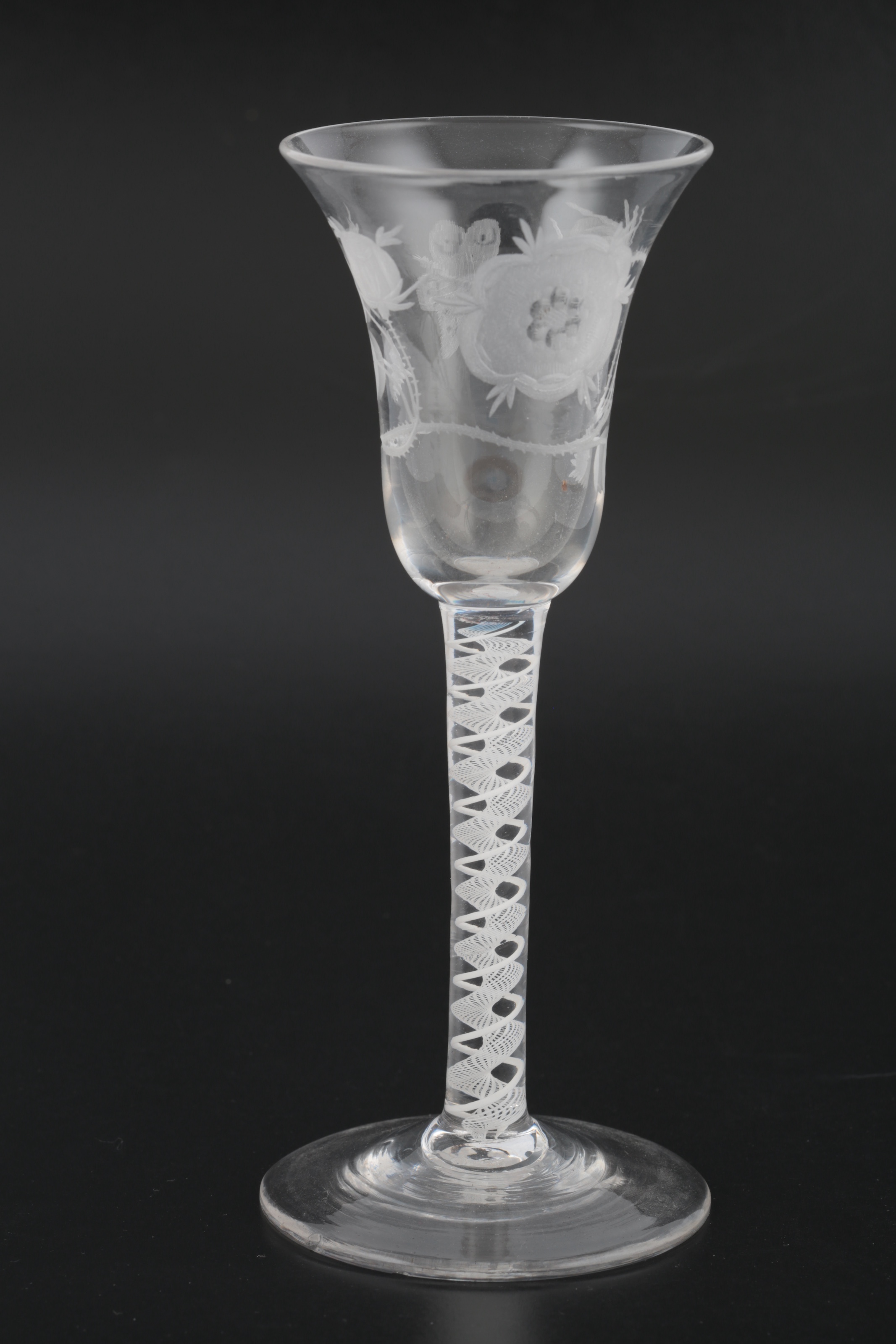 the bell shaped bowl wheel engraved with roses, above a double series opaque twist stem, on a slightly conical foot, 6.3cm high