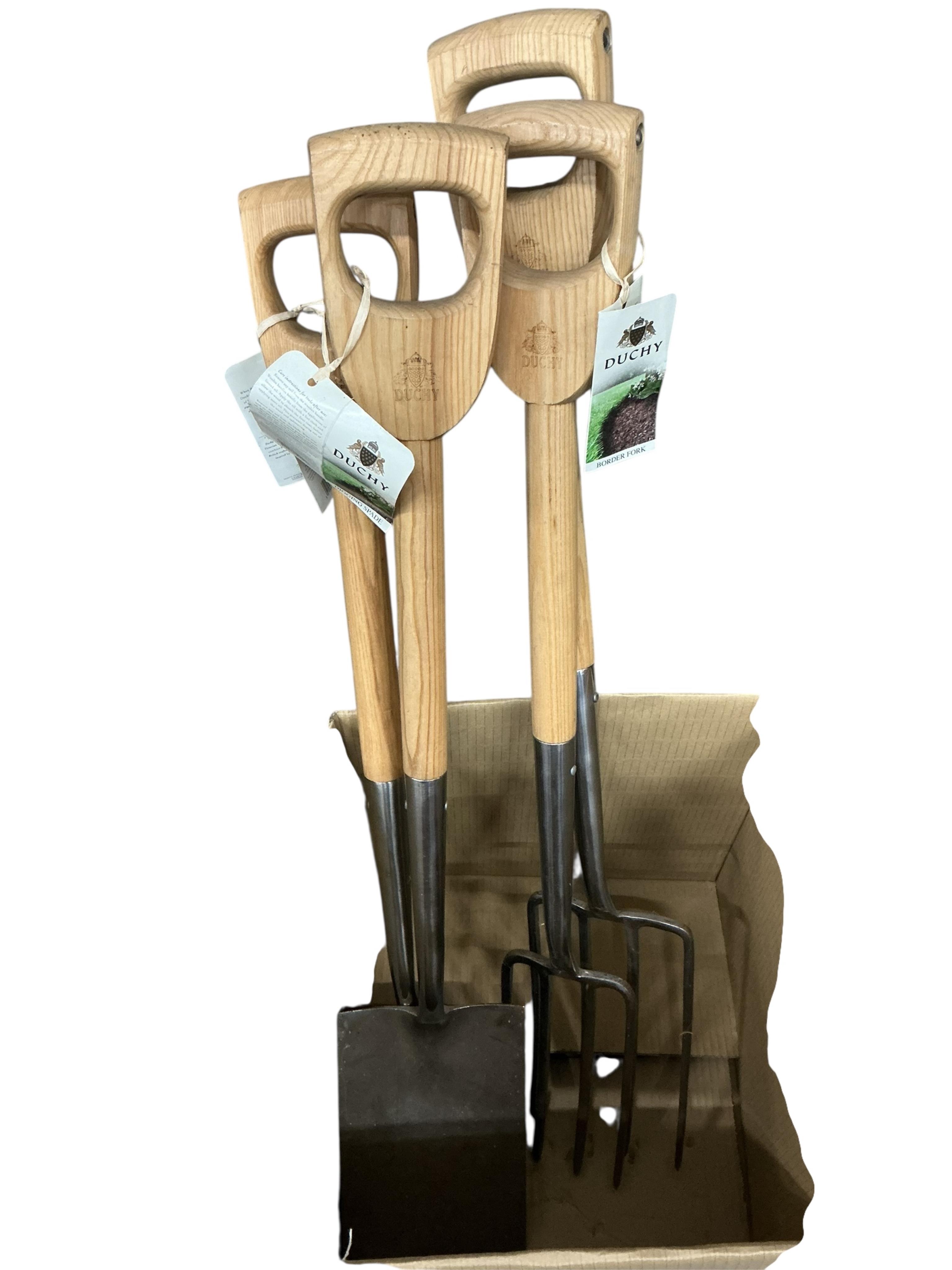 Lot 1065 , Four unused Duchy Originals garden tools; a digging spade, a border spade, a border fork, and a digging fork