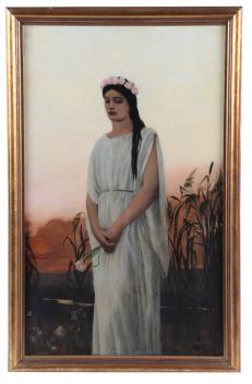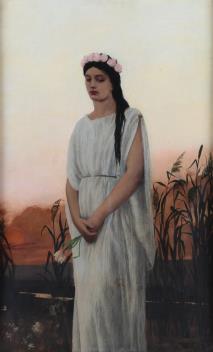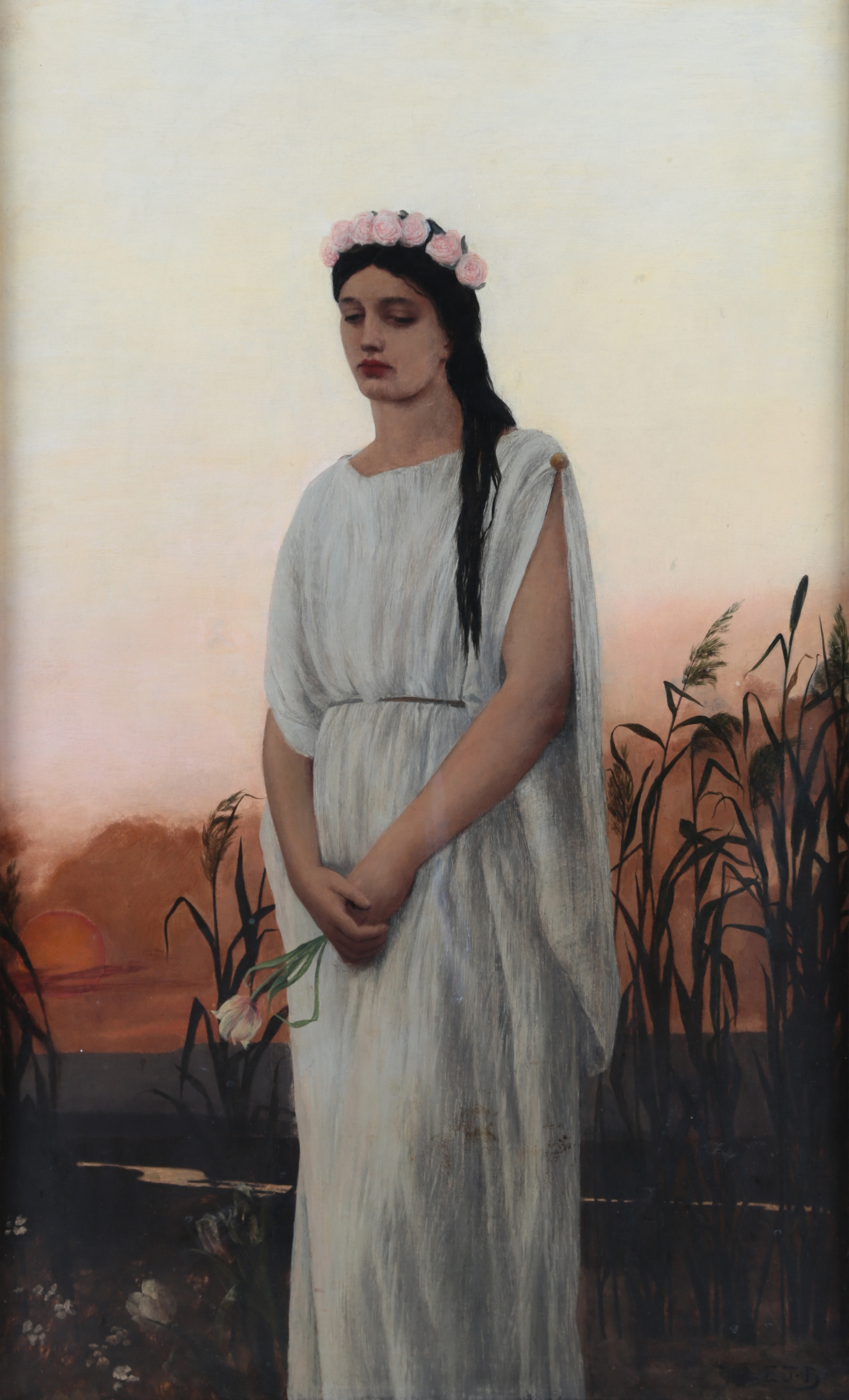 Full length study of the goddess Persephone, holding flowers, before reeds, water and the setting sun,