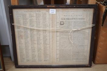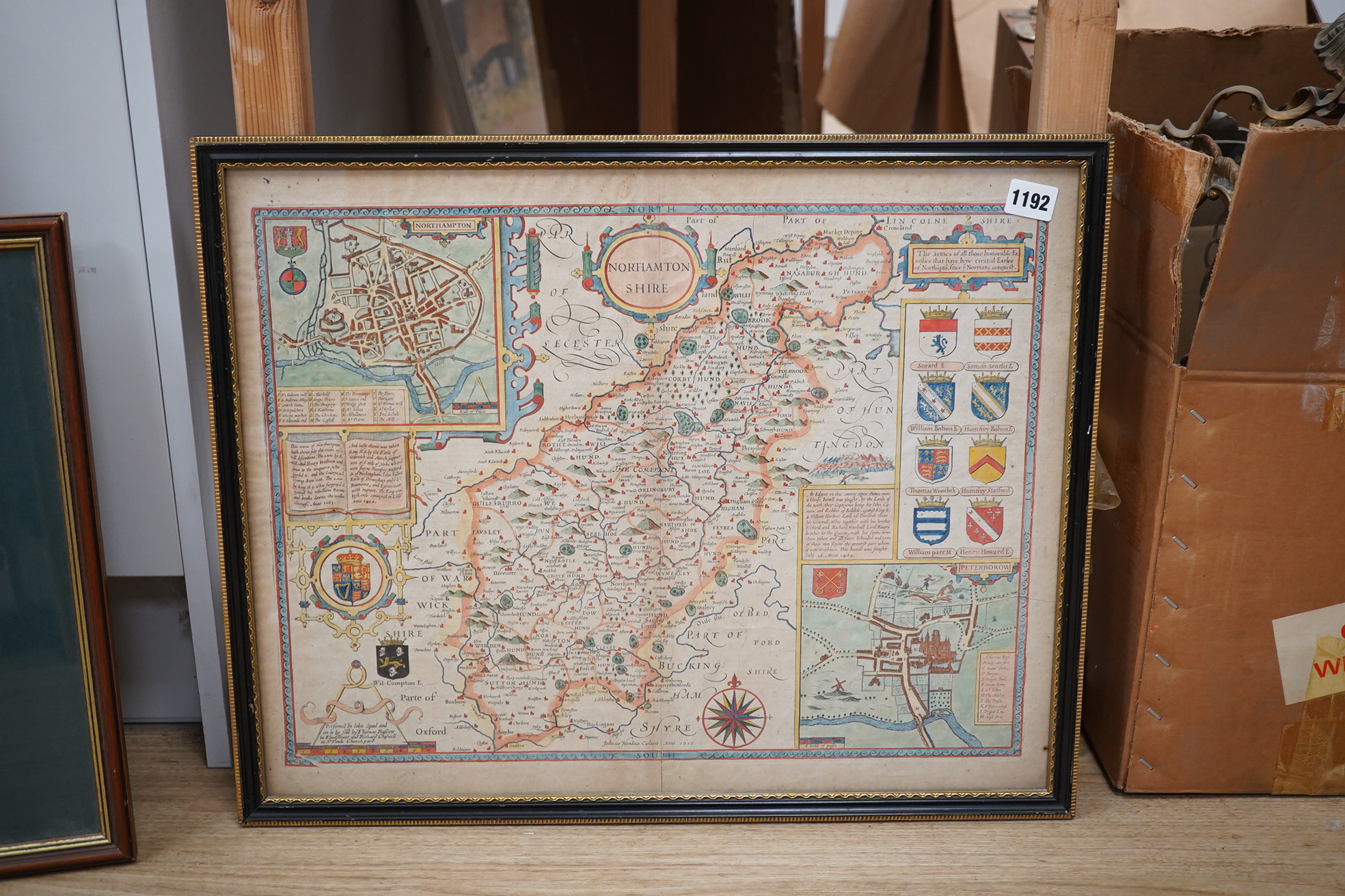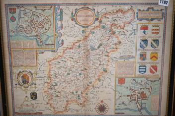 Lot 1192 , John Speed (1552-1629), ‘Northamptonshire’, hand coloured engraved map with inset town plans of Northampton & Peterborough and armorial shields, sold by Thomas Bassett and Richard Chiswell, English text verso, framed and