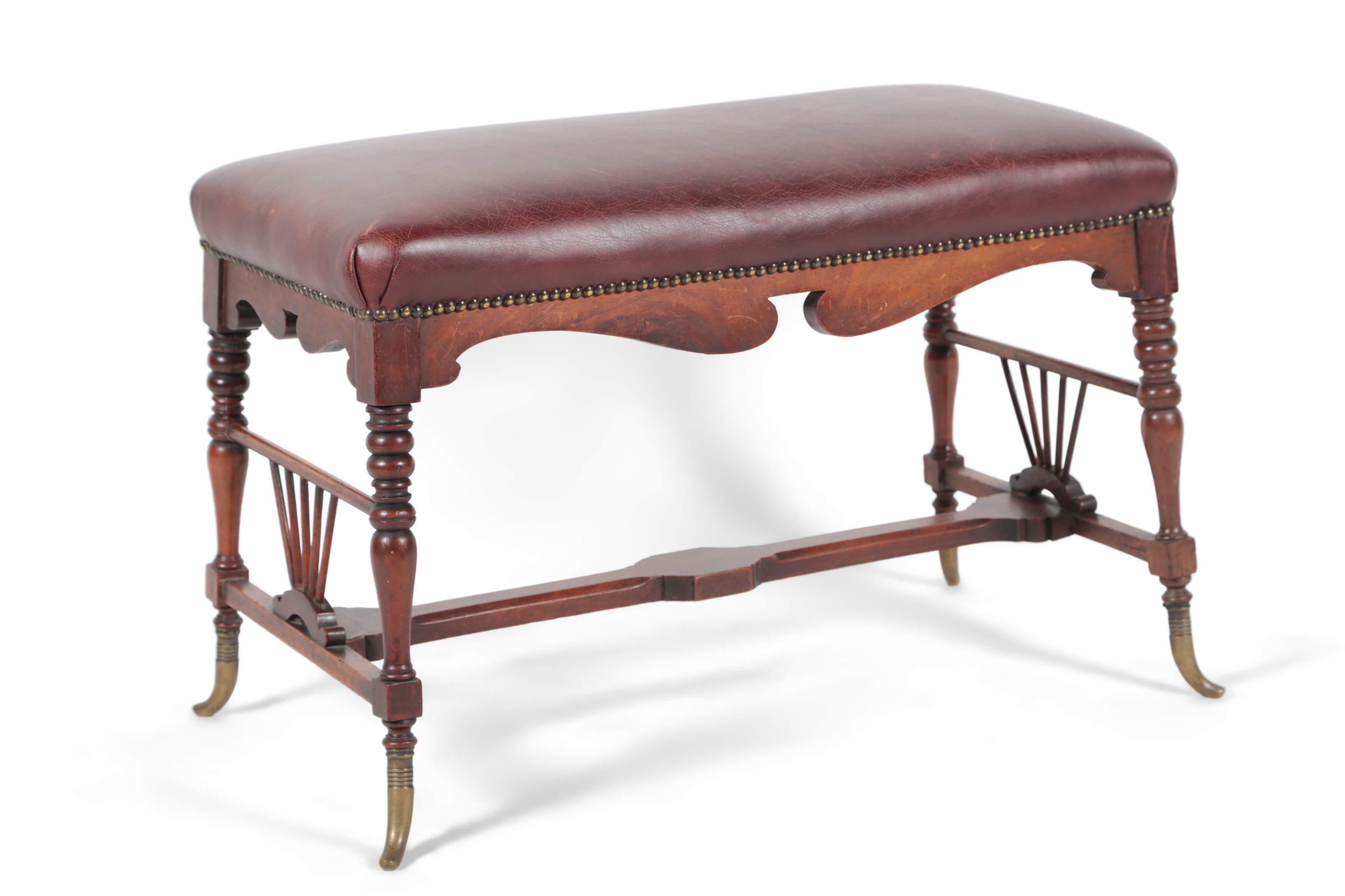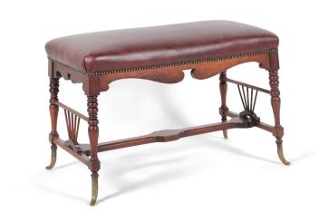 Manner of E.W. Godwin: An unusual Arts and Crafts mahogany duet stool, with splayed brass feet, bearing label under, ‘’S.R. Parsons, Furniture Rooms, 1813 & 1815, Notre Dame Street, Montreal, 50cm high x 82cm wide x 38cm deep