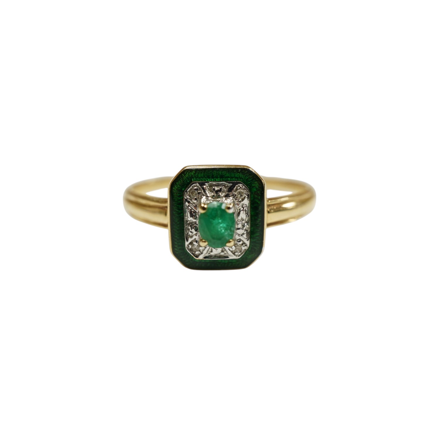 An emerald, enamel and diamond ring, centring on a panel set with an oval emerald, within a border of single-cut diamonds and green guilloché enamel, mounted in 14ct gold, size V, gross weight approximately 3 grams